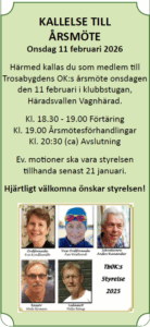 TbOK Årsmöte onsdag 11 februari 2026 KALLELSE TILL ÅRSMÖTE Onsdag 11 februari 2026 Härmed kallas du som medlem till Trosabygdens OK:s årsmöte onsdagen den 11 februari i klubbstugan, Häradsvallen Vagnhärad. Kl. 18.30 – 19.00 Förtäring Kl. 19.00 Läs mer »