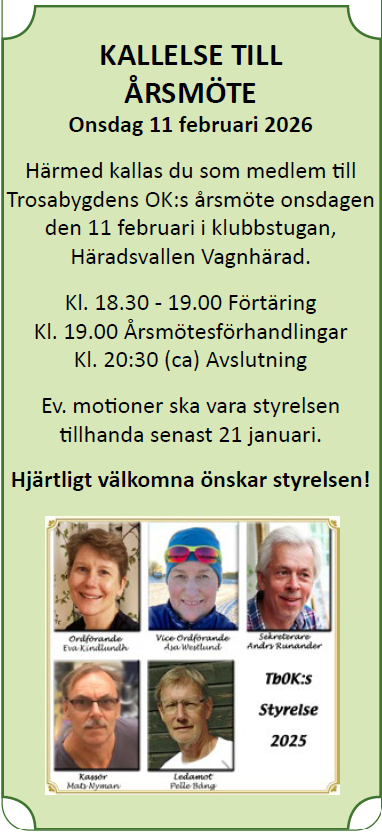 KALLELSE TILL ÅRSMÖTE Onsdag 11 februari 2026 Härmed kallas du som medlem till Trosabygdens OK:s årsmöte onsdagen den 11 februari i klubbstugan, Häradsvallen Vagnhärad. Kl. 18.30 – 19.00 Förtäring Kl. 19.00
